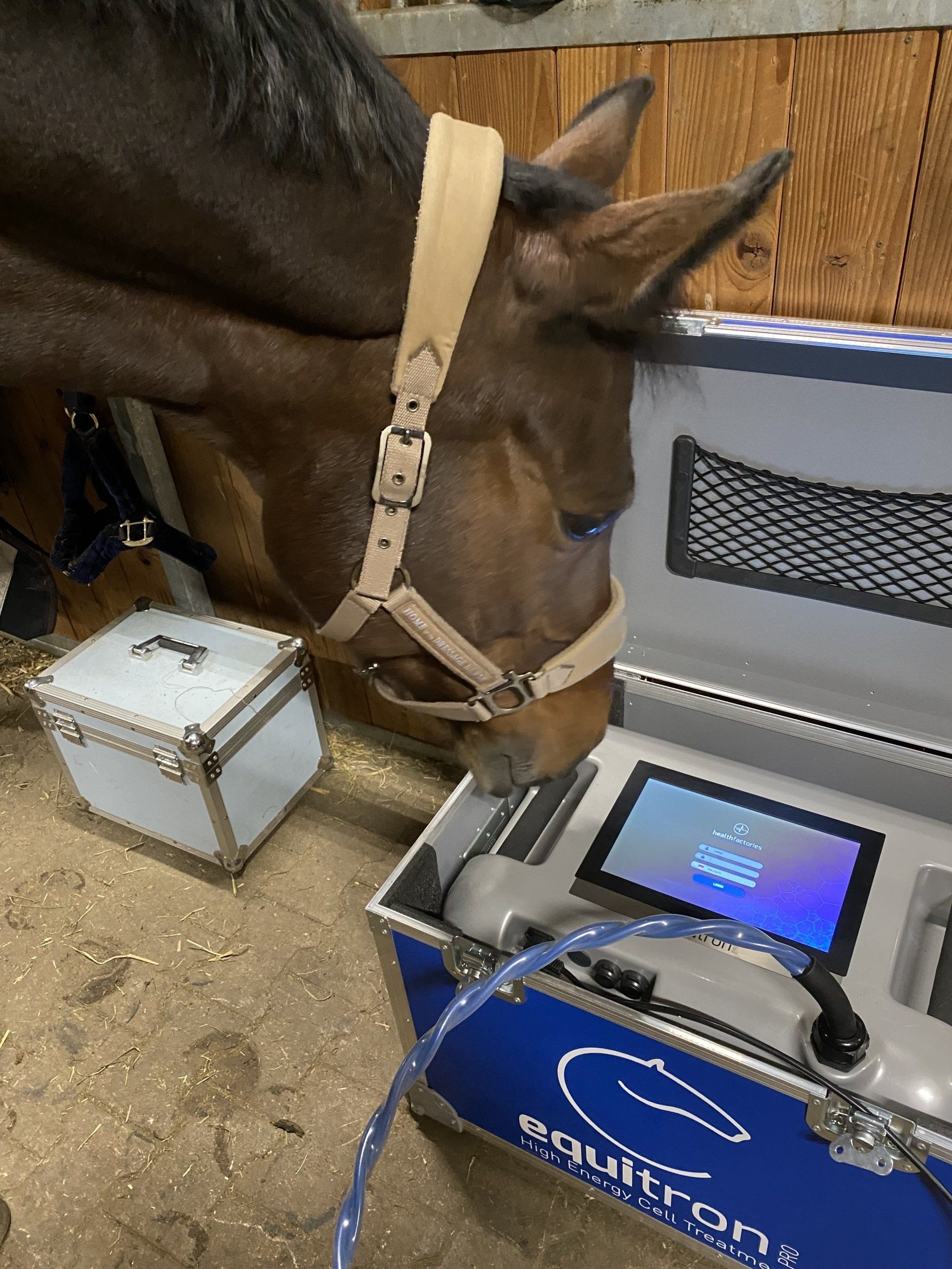 Equitron ist ein veterinärmedizinisches Therapiesystem, welches mit hohen Energien Pulse im Nanosekundenbereich erzeugt und über eine Behandlungsschlaufe an die betroffene Stelle appliziert. Dadurch werden Selbstheilungskräfte des Körpers um ein Vielfaches erhöht.